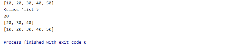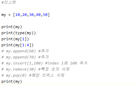 #리스트 my = [10,20,30,40,50] print(my) print(type(my)) print(my[1]) print(my[1:4]) # my.append(60) #추가 # my.append(70) #추가 # my.insert(1,100) #index 1에 100 추가 # my.remove(30) #특정 숫자 삭제 # my.pop(0) #해당 인덱스 삭제 print(my) |