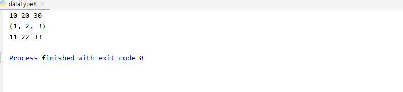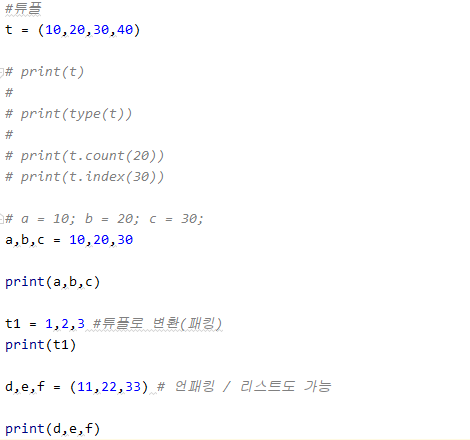 #튜플 t = (10,20,30,40) # print(t) # # print(type(t)) # # print(t.count(20)) # print(t.index(30)) # a = 10; b = 20; c = 30; a,b,c = 10,20,30 print(a,b,c) t1 = 1,2,3 #튜플로 변환(패킹) print(t1) d,e,f = (11,22,33) # 언패킹 / 리스트도 가능 print(d,e,f) |