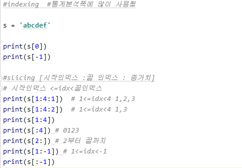 #indexing #통계분석쪽에 많이 사용됨 s = 'abcdef' print(s[0]) print(s[-1]) #slicing [시작인덱스 :끝 인덱스 : 증가치] # 시작인덱스 <=idx<끝인덱스 print(s[1:4:1]) # 1<=idx<4 1,2,3 print(s[1:4:2]) # 1<=idx<4 1,3 print(s[1:4]) print(s[:4]) # 0123 print(s[2:]) # 2부터 끝까지 print(s[1:-1]) # 1<=idx<-1 print(s[:-1]) |